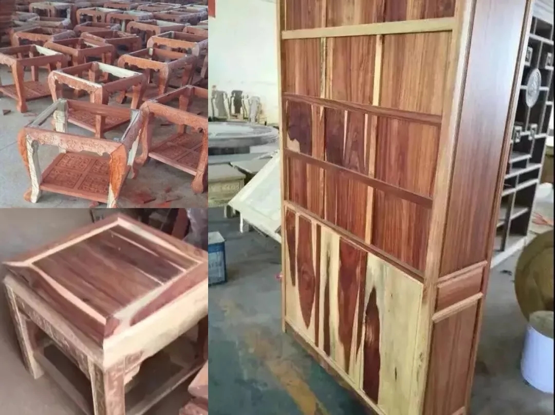 最容易摻假材質有非洲酸枝(伯克蘇木)、木果緬茄(老撾紅木、紅花梨)、非洲紫檀(非洲花梨、紅花梨、亞花梨)、安哥拉紫檀(高棉紅 非洲緬花)。劣質紅木家具把這幾種材質和大果紫檀混拼,再打蠟或上漆。