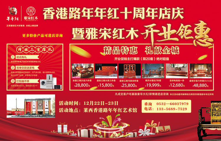 新聞動(dòng)態(tài) News 企業(yè)新聞 行業(yè)新聞 紅木知識(shí) 媒體報(bào)道 企業(yè)新聞 行業(yè)新聞 紅木知識(shí) 媒體報(bào)道 雅宋紅木 禮惠全城 信息來(lái)源:信息中心 更新時(shí)間:2018-12-19 收藏此頁(yè) 青島萊西香港路年年紅十周年店慶暨雅宋紅木開(kāi)業(yè)盛典! 12月22日-23日,20套精品特惠,進(jìn)店三重厚禮! 地址:山東省萊西市香港路年年紅藝術(shù)館(沙嶺村委北鄰) 電話:13356897529(賀先生) 【打印此文】 【關(guān)閉窗口】 上一篇:雅宋紅木 | 有溫度的緬甸花梨家具品牌 下一篇:沒(méi)有了