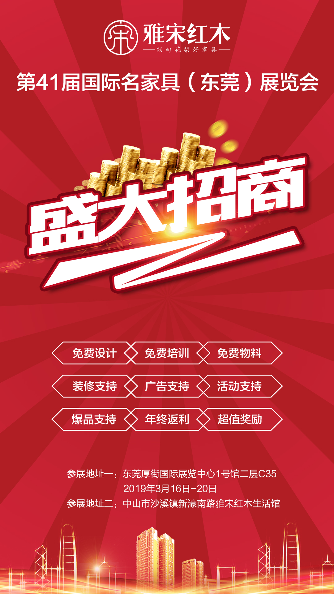 雅宋比任何公司都更重視人,志在與志同道合的朋友一起傳播雅宋精神、一起傳播紅木文化、一起傳播雅致生活理念。雅宋紅木給予合作伙伴最強有力的支持,除了有好的品牌理念以及好的產品之外,此次名家具展,我們也面對全國盛大招商,特給出以下九大福利: