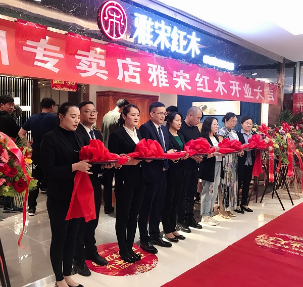 雅宋紅木總經(jīng)理石擁軍、膠州旗艦店總經(jīng)理?xiàng)羁偂⒁约爸匾钨e進(jìn)行剪彩儀式