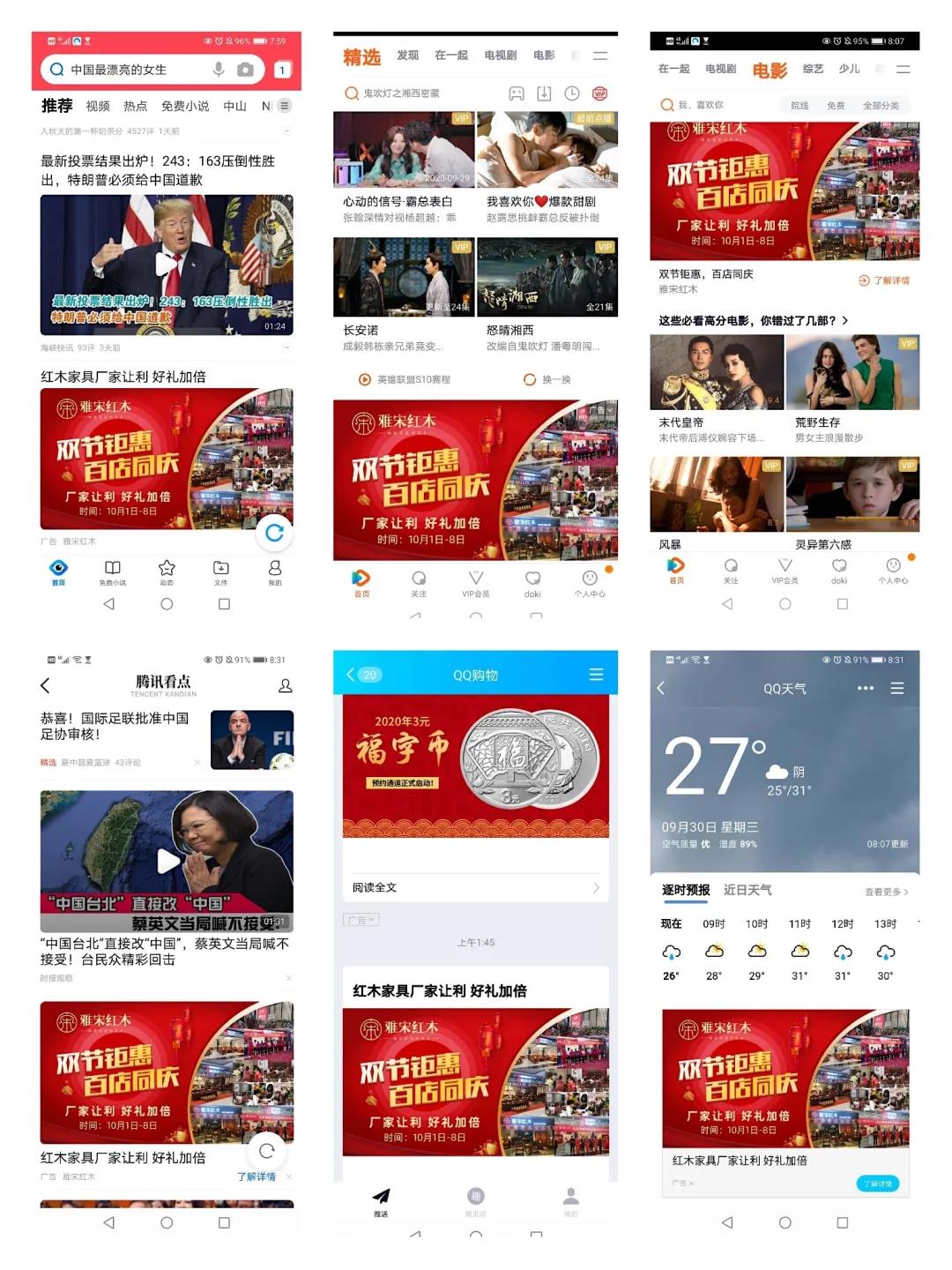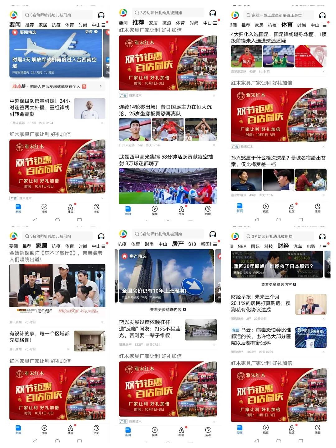 騰訊新聞-要聞、推薦、家居、房產(chǎn)、財(cái)經(jīng)、體育等主流頻道,均被“雅宋紅木百店同慶”廣告霸屏