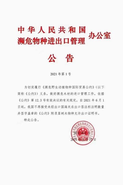 5月12日,中華人民共和國(guó)瀕危物種進(jìn)出口管理辦公室發(fā)布2021年第1號(hào)公告,自2021年6月1日起,我國(guó)不再接受未經(jīng)出口國(guó)海關(guān)在出口簽注欄注明數(shù)量并簽字蓋章的《瀕危野生動(dòng)植物種國(guó)際貿(mào)易公約》(CITES)附錄Ⅱ樹木物種允許出口證明書。此公告一出,再次引起紅木業(yè)界的關(guān)注和熱議。